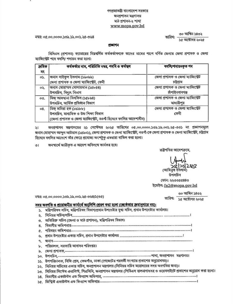 ২১ সেপ্টেম্বর সকালে জনপ্রশাসন মন্ত্রণালয়ের উপ সচিব আমিনুল ইসলাম স্বাক্ষরিত প্রজ্ঞাপনে চট্টগ্রামের জেলা প্রশাসক ফরিদা খানমকে সরিয়ে নওগাঁর ডিসি মোহাম্মদ আব্দুল আউয়ালকে চট্টগ্রামের জেলা প্রশাসক ও জেলা ম্যাজিস্ট্রেট হিসেবে আদেশ জারি করেন। প্রজ্ঞাপনে স্পষ্টভাবে উল্লেখ করা হয়েছে, গত ২১ সেপ্টেম্বর জারি করা যে প্রজ্ঞাপনে নওগাঁর ডিসি মোহাম্মদ আব্দুল আউয়ালকে চট্টগ্রামের ডিসি করা হয়েছিল, সেটি বাতিল করা হলো। জনস্বার্থে নতুন এই আদেশ অবিলম্বে কার্যকর হবে বলেও প্রজ্ঞাপনে জানানো হয়েছে।