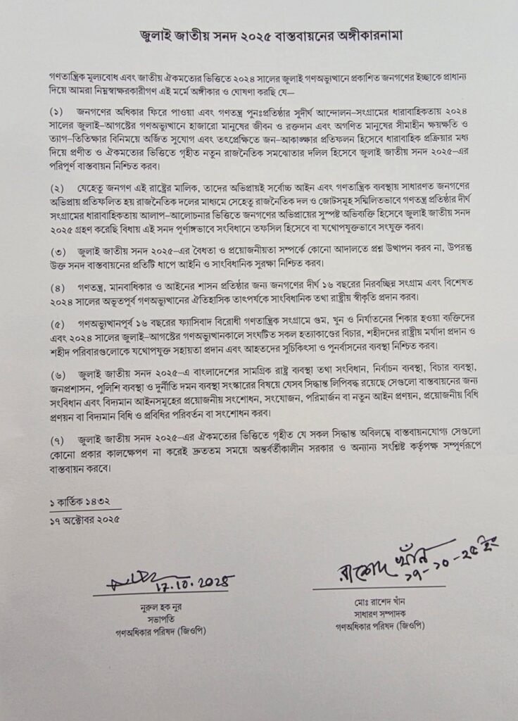 শুক্রবার (১৭ অক্টোবর) বিকেল ৫টার দিকে আনুষ্ঠানিকভাবে এ সনদে স্বাক্ষর করা হয়, যা ২০২৪ সালের জুলাই-আগস্টের গণঅভ্যুত্থানে জনগণের ত্যাগ ও রক্তদানের প্রতি শ্রদ্ধা জানিয়ে প্রণীত নতুন রাজনৈতিক সমঝোতার দলিল হিসেবে গণ্য হচ্ছে। এতে সাতটি মূল অঙ্গীকারের মাধ্যমে রাষ্ট্রীয় পুনর্গঠনের রূপরেখা তুলে ধরা হয়েছে।