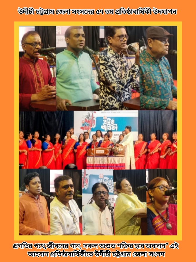 সাম্প্রদায়িক অপশক্তিকে প্রতিহত করার আহ্বানের মধ্য দিয়ে এবং প্রগতির লড়াইকে দৃঢ় করার দৃপ্ত শপথের মধ্য দিয়ে উদীচীর ৫৭তম প্রতিষ্ঠাবার্ষিকী উদযাপিত হয়েছে। বুধবার, সন্ধ্যা ৭ টায়,উদীচী চট্টগ্রাম জেলা সংসদের আয়োজনে জেলা শিল্পকলা একাডেমী প্রাঙ্গনে জাতীয় সংগীত ও সংগটন সংগীত পরিবেশনার মধ্য দিয়ে অনুষ্ঠিত হয়।উদীচী শিল্পীগোষ্ঠীর বর্তমান এবং সাবেক শিল্পীকর্মী ও শুভানুধ্যায়ীদের অংশগ্রহণে এক আনন্দময় পরিবেশের সৃষ্টি হয় জেলা শিল্পকলা একাডেমির গ্যালারী প্রাঙ্গন। কথামালায় অংশ নিয়ে অতিথি এবং শিল্পীকর্মীরা সাম্প্রদায়িক সম্প্রীতি রক্ষায় প্রতিবাদী উচ্চারণ করেন,এবং গানের সুরে, কবিতার ছন্দে ও কথনে ব্যক্ত করেন সাংস্কৃতিক শক্তি দিয়ে অশুভ শক্তিকে রুখে দেওয়ার প্রত্যয়। প্রগতির পথে জীবনের জয়গান গেয়ে সকল শোষিত নিপীড়িত মানুষের অধিকার প্রতিষ্ঠার লড়াইকে বেগবান করার দৃপ্ত ধ্বনি উচ্চারিত হয়। আলোচনা হতে।